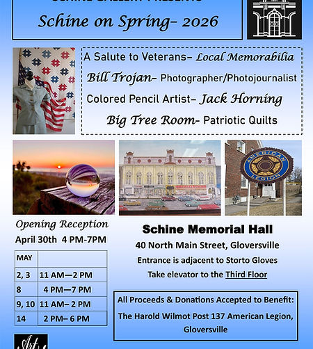 The Schine Gallery, 40 N Main St., 3rd Floor - This exhibit includes “A Salute to Veterans” with local memorabilia, pieces by photographer/photojournalist Bill Trojan, pieces by colored pencil artist Jack Horning, and patriotic quilts. All proceeds and donations will go to the Harold Wilmot Post 137 American Legion in Gloversville.